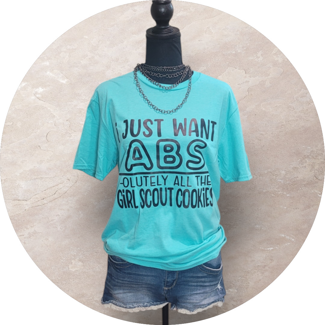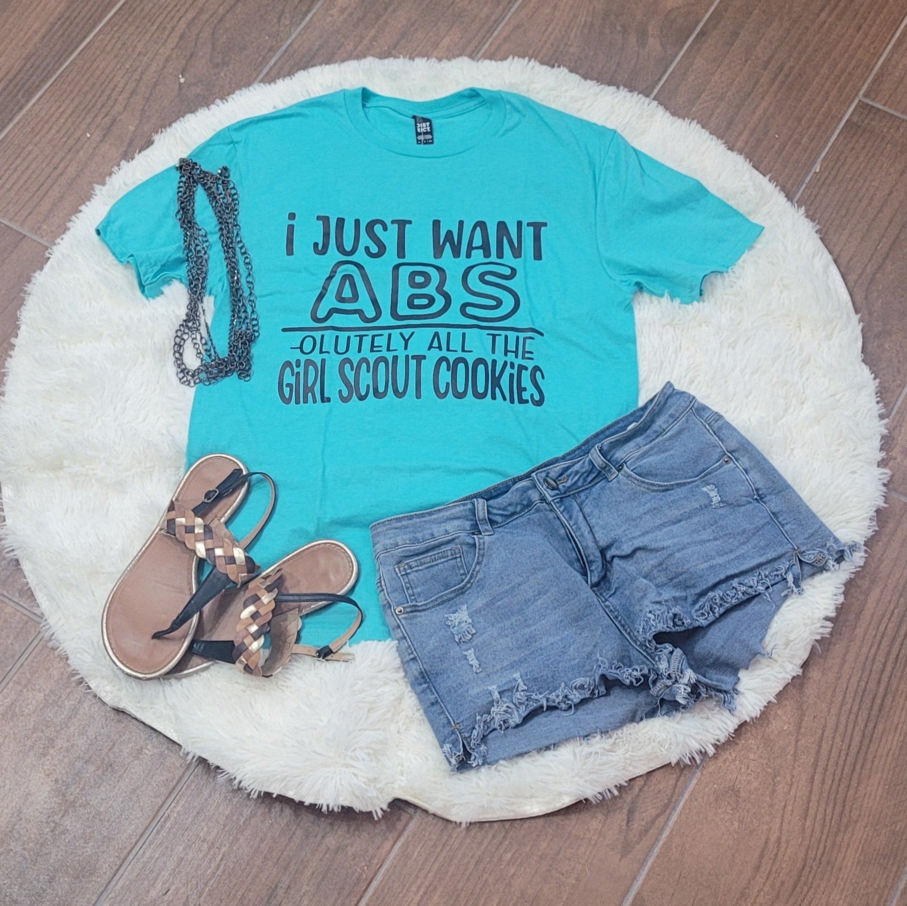 Indulge in your sweet tooth with our Girl Scout Cookies t-shirt, featuring a playful graphic that says, "I want abs-olutely all the girl scout cookies". Perfect for anyone who loves a good pun and isn't afraid to show it off. Don't resist the temptation, treat yourself today!