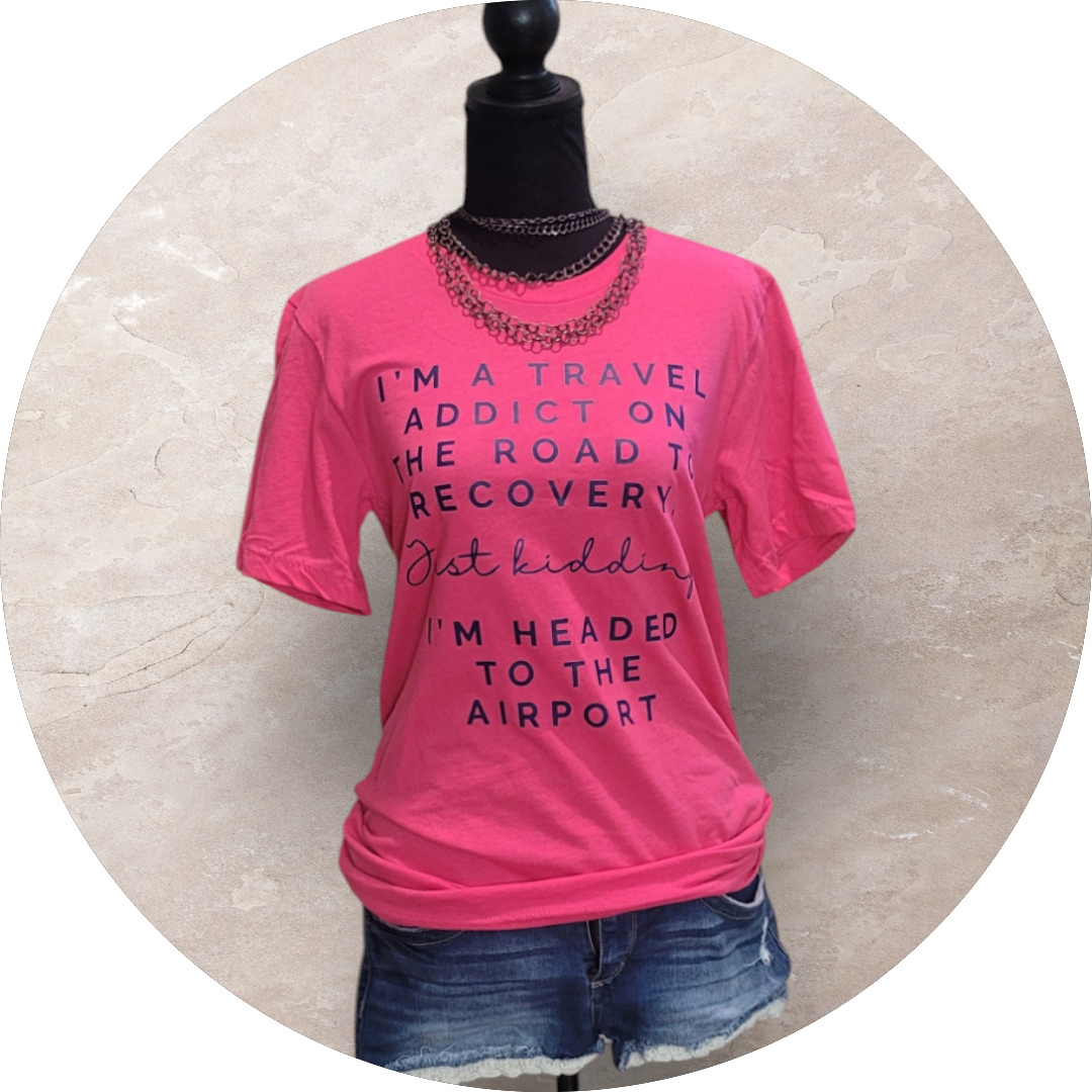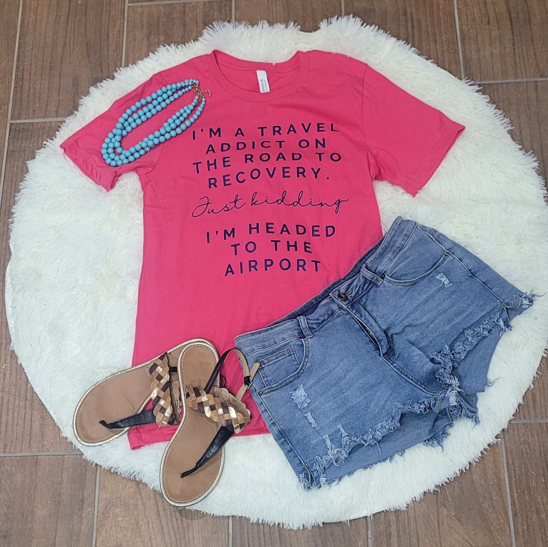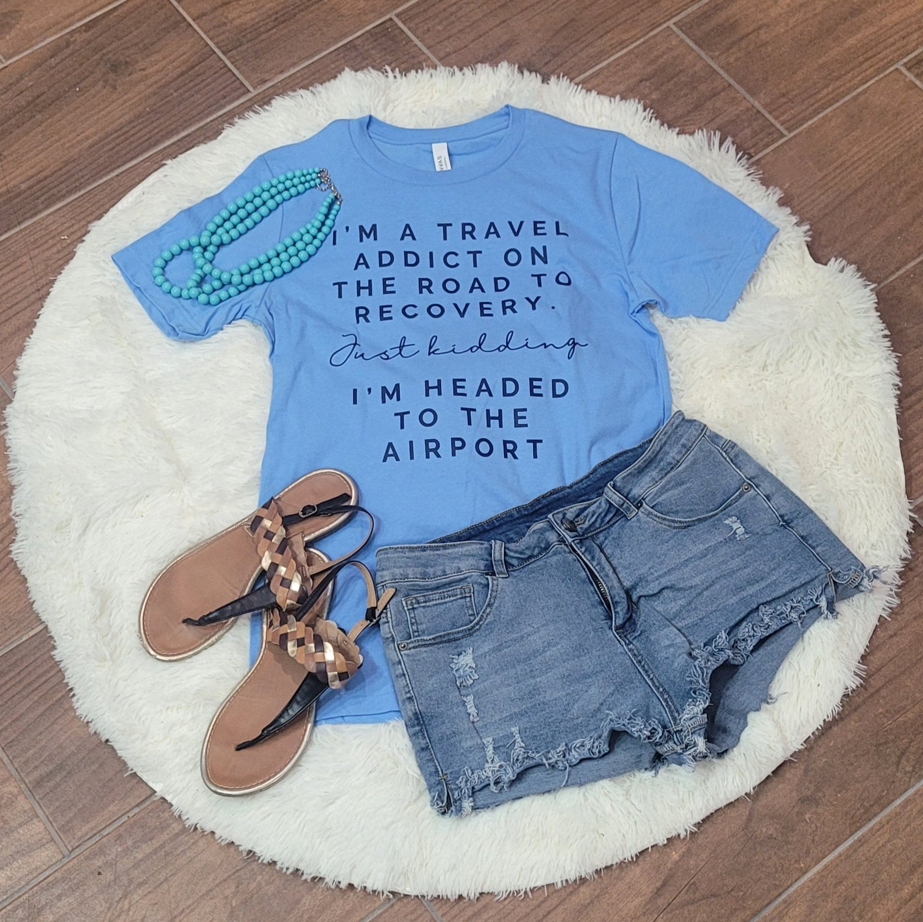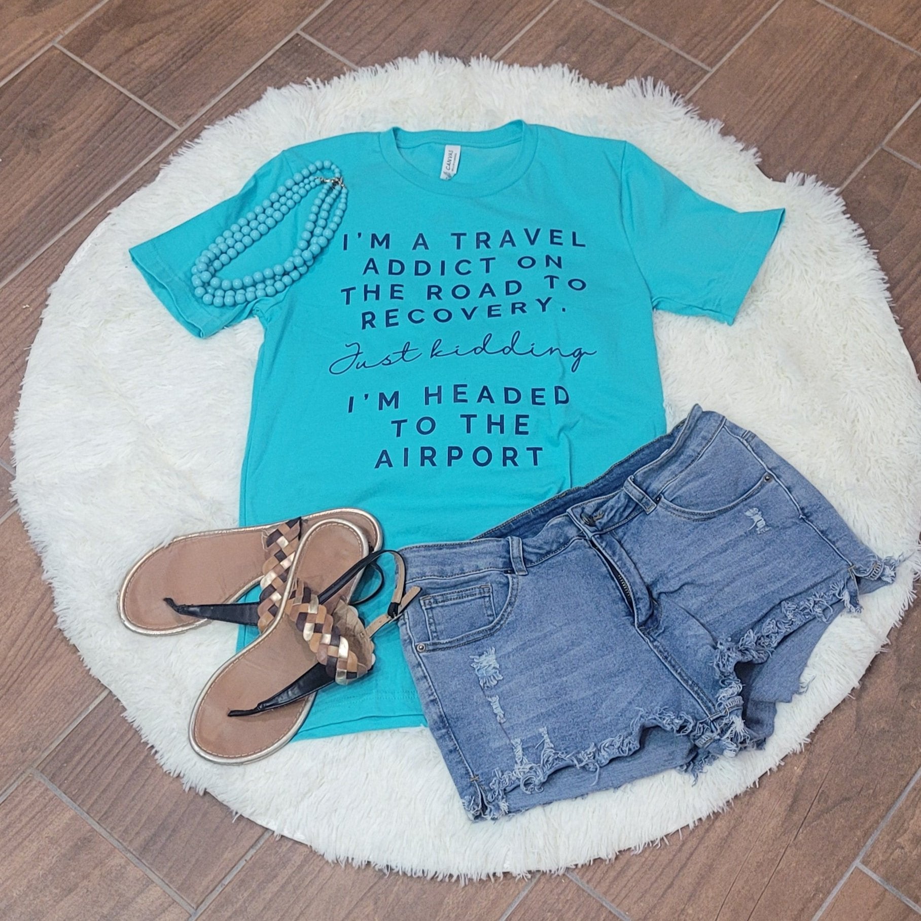 Are you a travel addict? Show off your love for exploring new destinations with our Travel Addict Tee. This short sleeve tee features a navy-blue graphic on the front that will make a statement wherever you go. Made with soft and comfortable fabric, it comes in bright colors such as fuchsia, bright aqua, and Carolina blue, making it the perfect addition to your travel wardrobe. Whether you're off on an adventure or just dreaming of your next getaway, this tee is a must-have for any travel enthusiast.