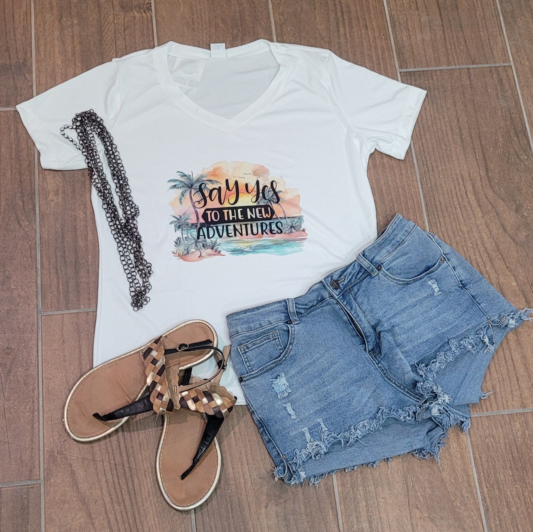Discover the spirit of adventure with our 'Say Yes to Adventures' Women's Tee. Crafted from 100% polyester, this T-shirt offers a luxurious feel and optimal stretch. The watercolor design adds an artistic touch, echoing the vibrant energy of exploration. Available in sizes S-XL, this tee ensures a comfortable and stylish fit for all. Embrace the call of the wild, express your love for adventure, and make a statement wherever your journey takes you. Let every day be an opportunity to say yes to new experiences. Wear it proudly and embark on your next adventure!