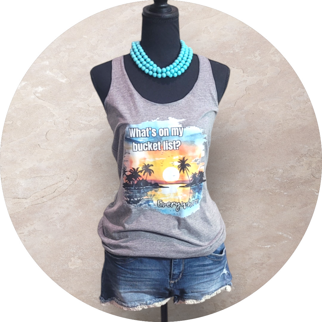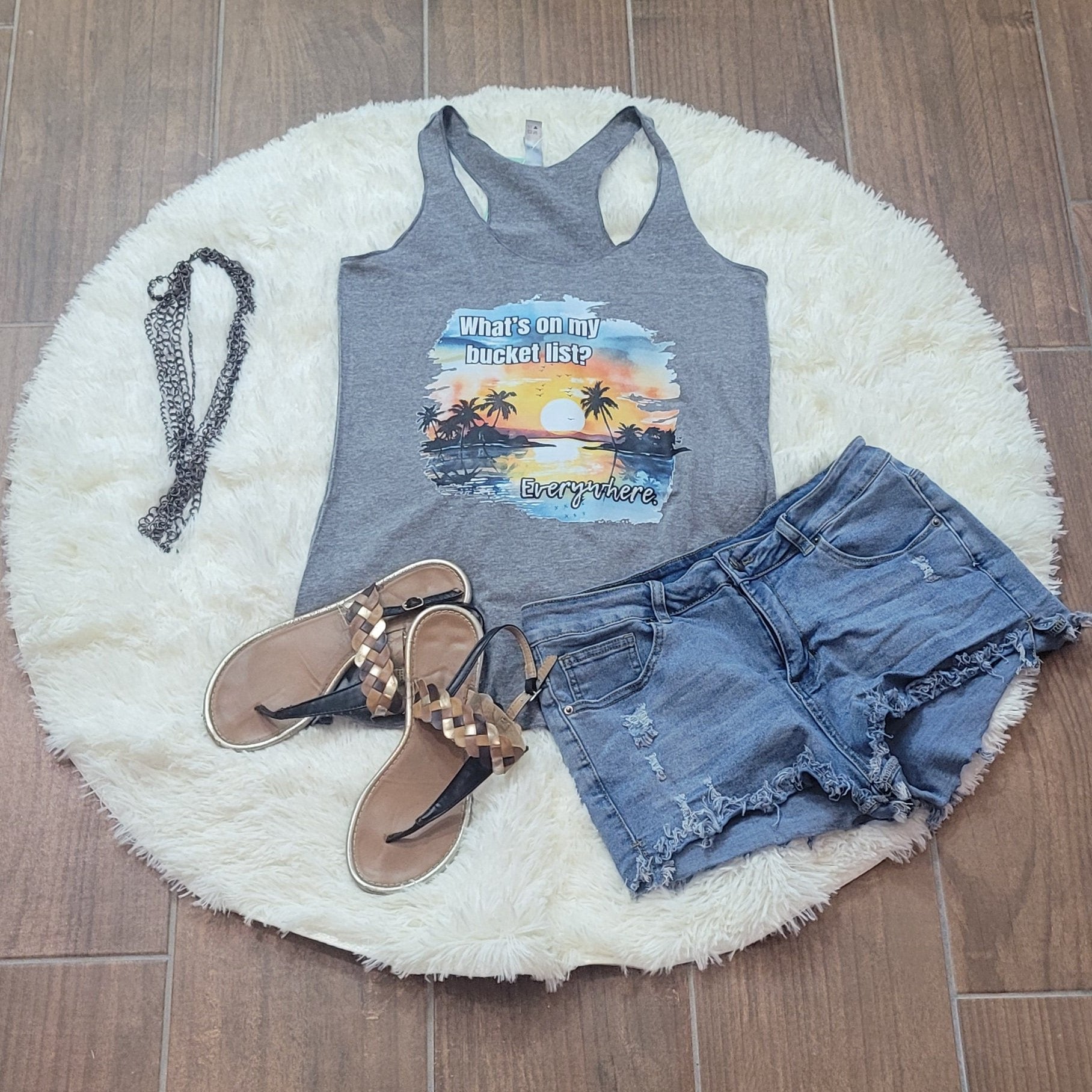 Get ready to embrace the adventurous spirit with our Bucket List Tank! This lightweight tank features a bold graphic design that serves as a reminder to make the most of every moment. It's the perfect addition to your travel wardrobe.