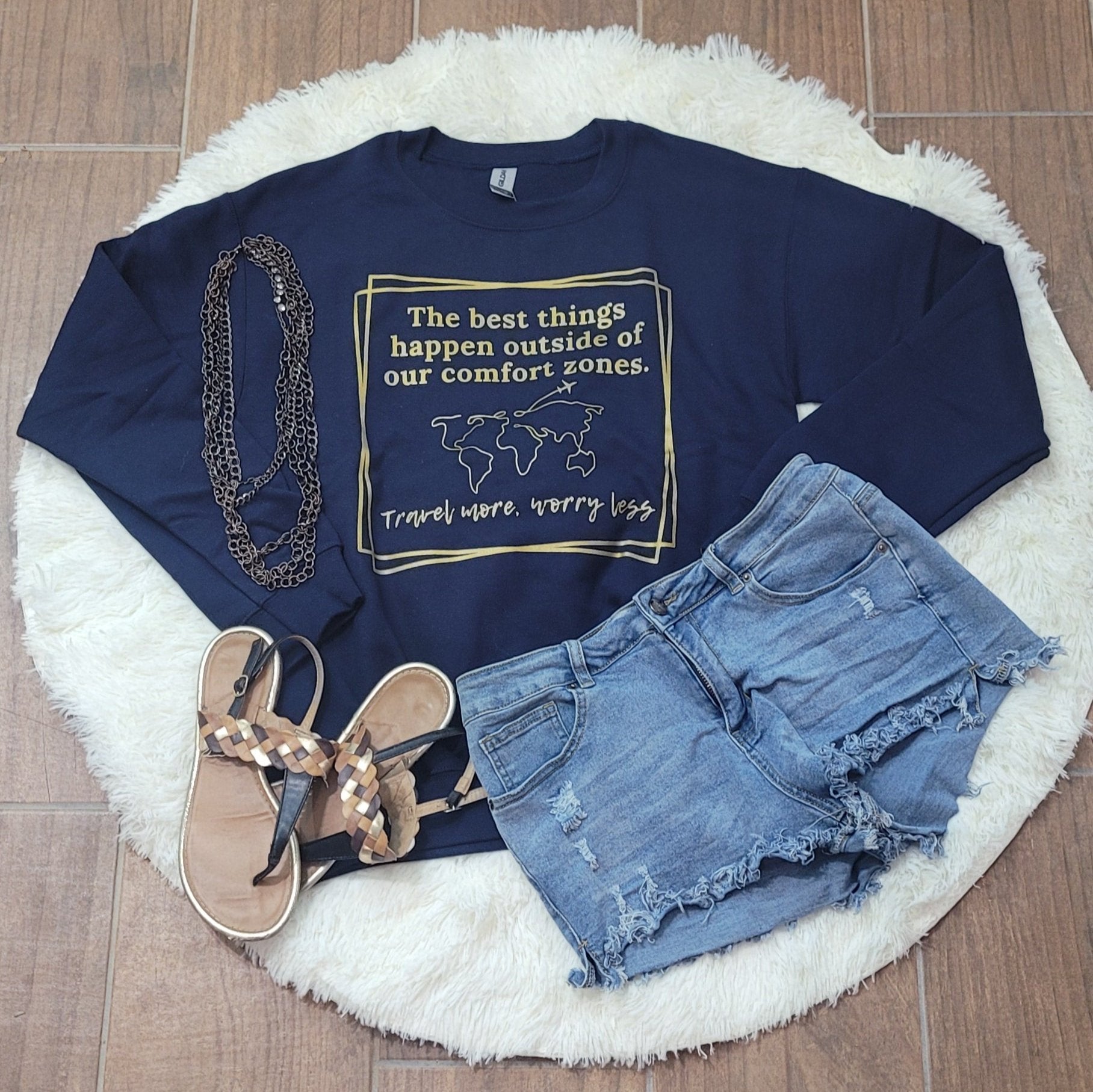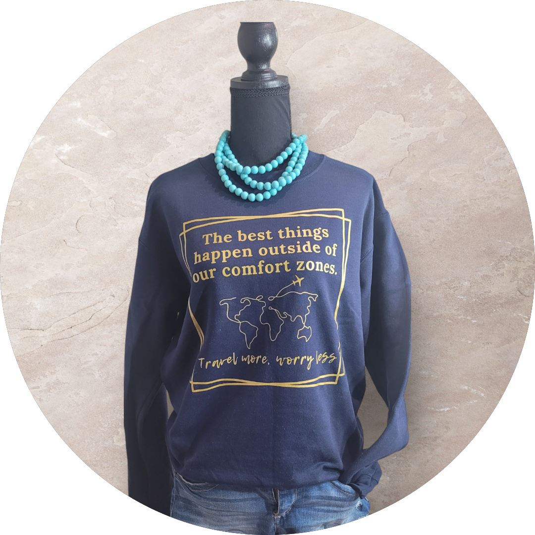 Looking for a cozy and stylish way to show off your love for travel? Look no further than our Travel More, Worry Less Crew Neck! This fleece lined pull over is perfect for staying warm on those chilly travel days, while the metallic gold graphic adds a touch of glamour to your outfit. The crew neck comes in three optional colors: maroon, navy blue, and heather navy, so you can choose the one that best suits your personal style.