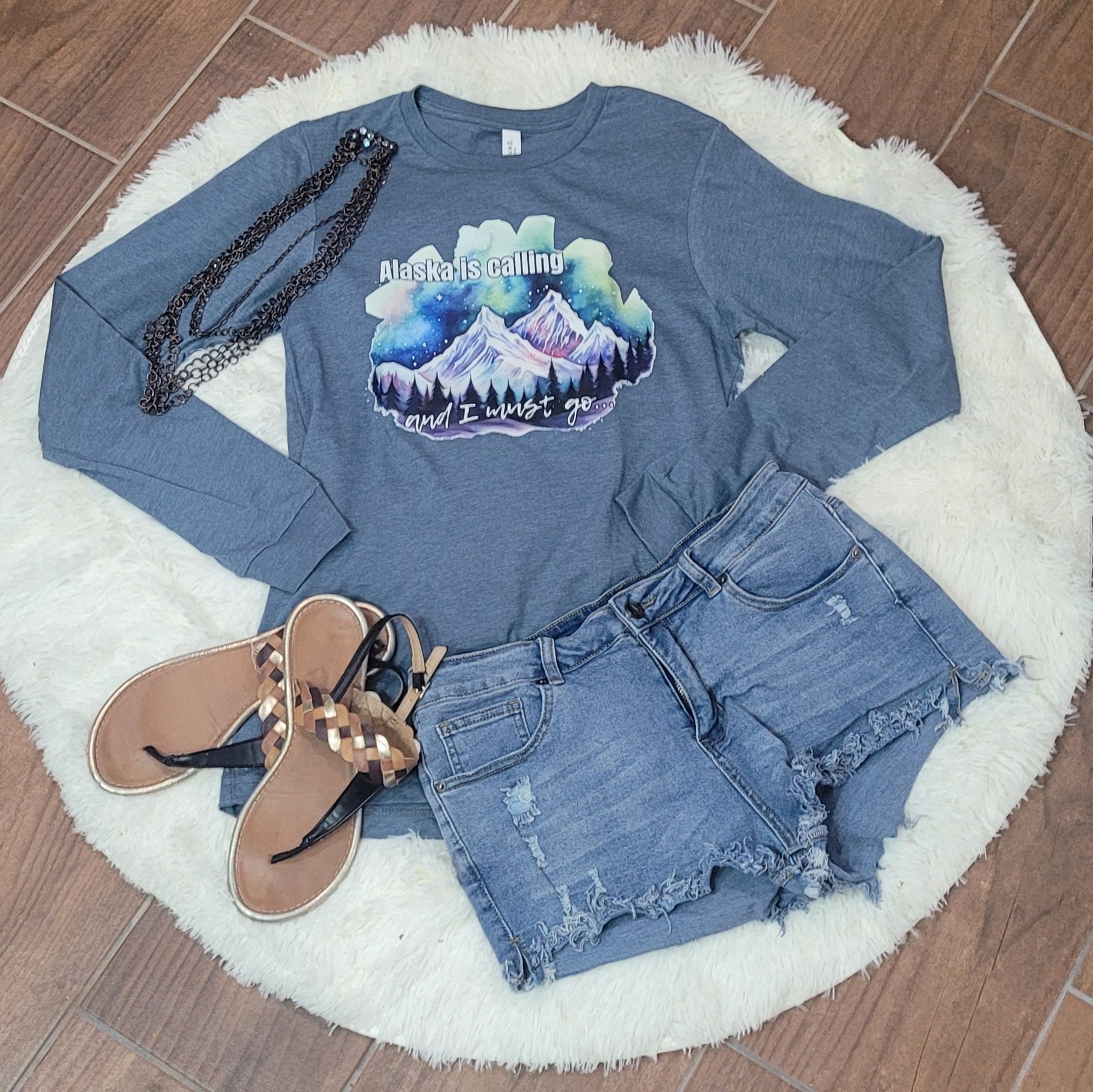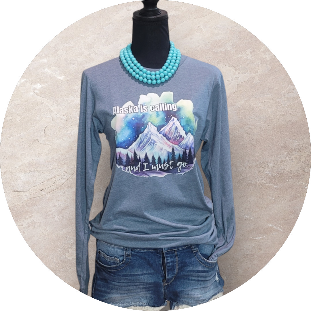 Embrace the call of the wild with our Alaska is Calling Tee! This long-sleeved t-shirt features a full-color watercolor graphic of the stunning Alaskan landscape, complete with mountains, forests, and wildlife. Whether you've visited Alaska before or have it on your travel bucket list, this shirt is the perfect way to show off your love for the Last Frontier. Made with soft, breathable fabric, it is comfortable enough for all your adventures, from hiking through Denali National Park to strolling through downtown Anchorage.