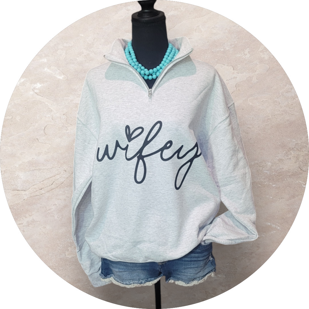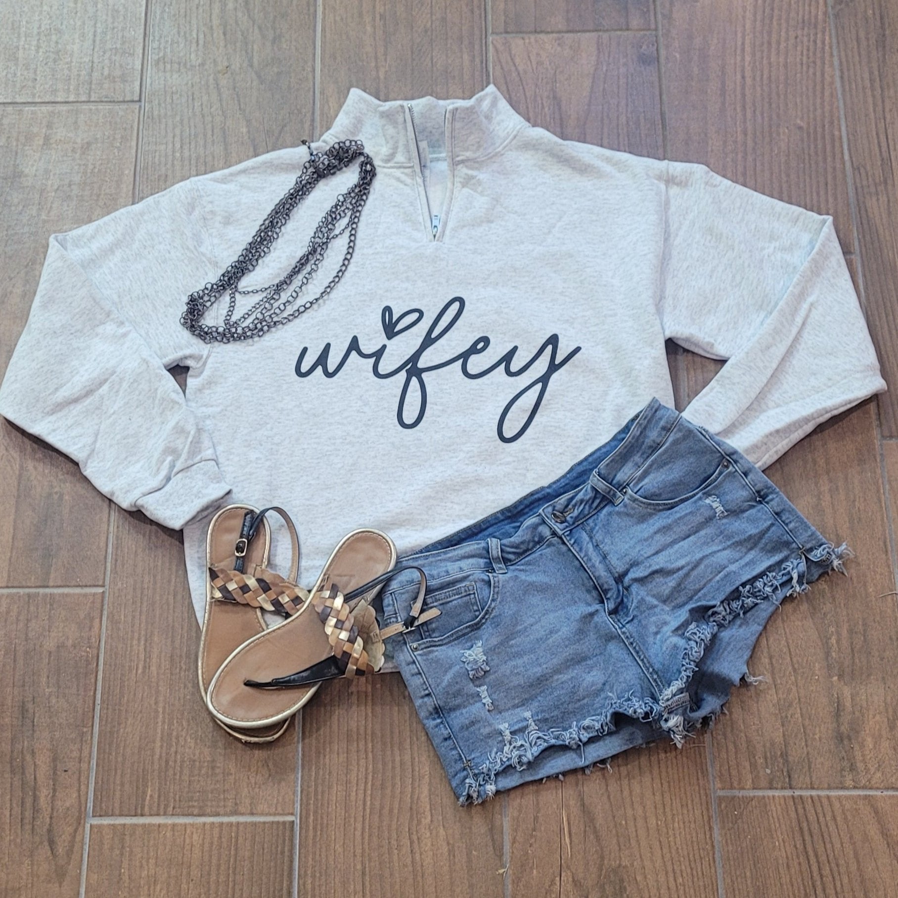 Be the ultimate wifey with our Wifey Pullover. This comfy 3/4 zip up pull over proudly displays the word "wifey" on the front. Perfect for any occasion. Wear it for a comfy day in or traveling for your honeymoon, stay cozy and stylish at the same time. Say "I do" to this pullover today!